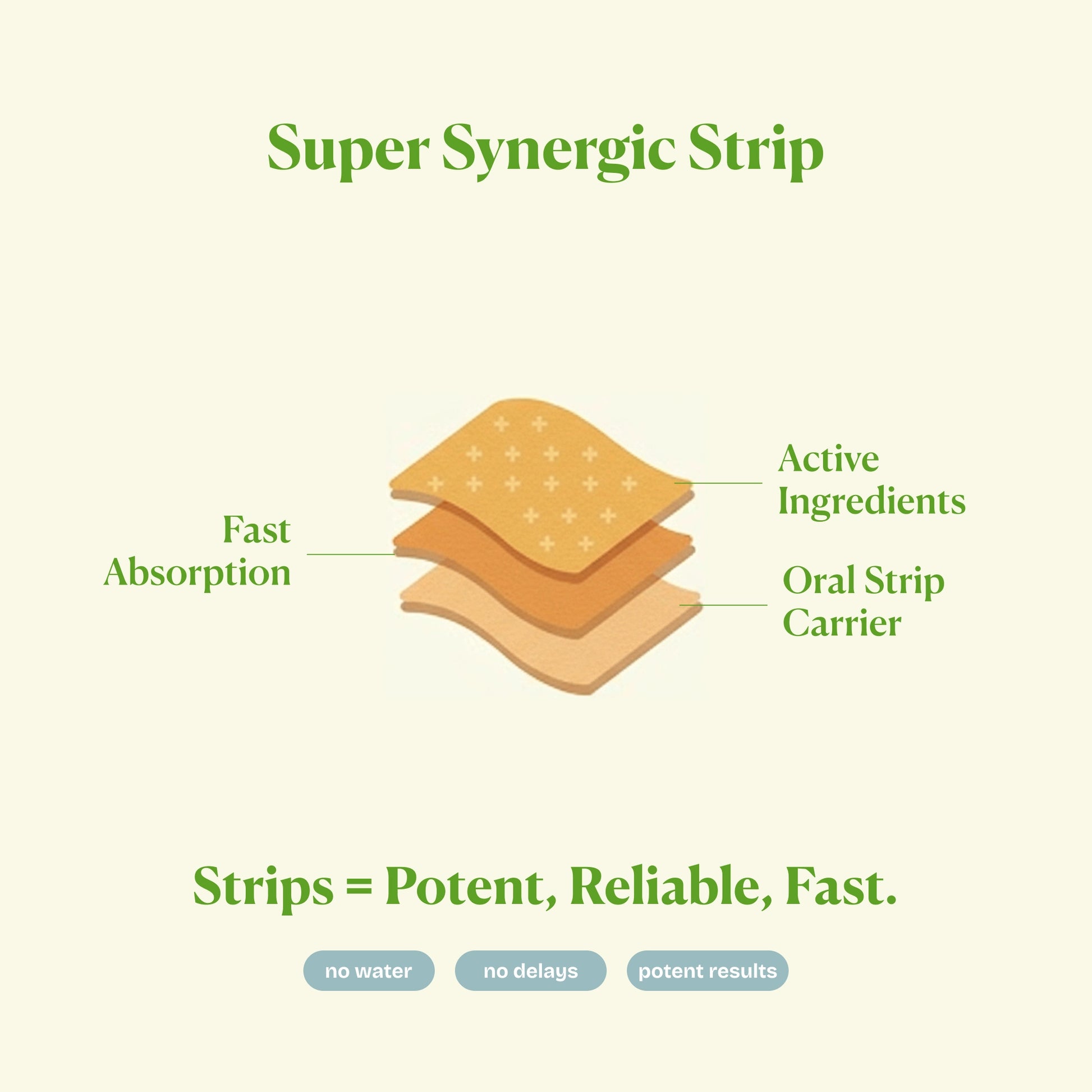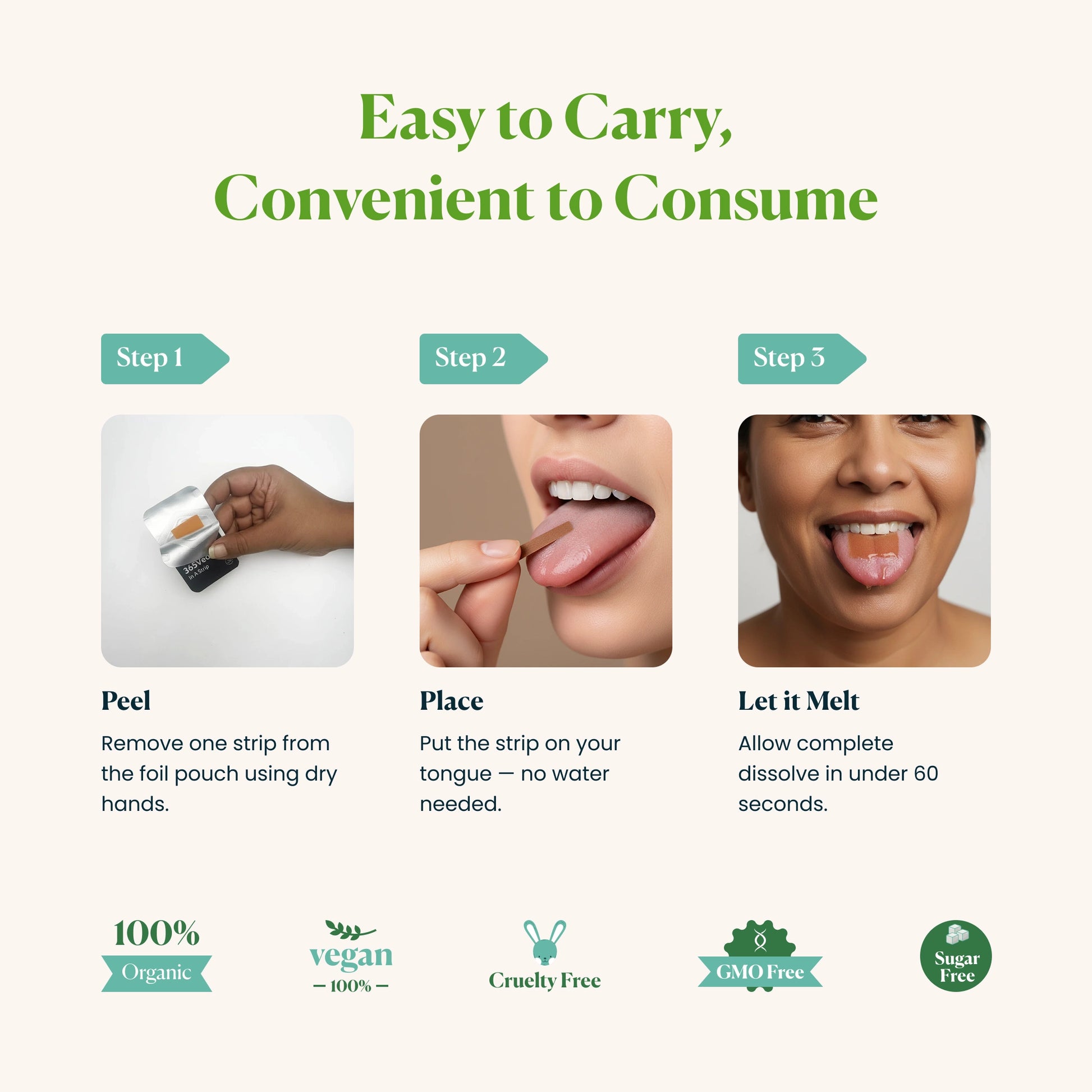 Unlike tablets or capsules, these strips dissolve on your tongue, allowing nutrients to absorb quickly through the oral mucosa for faster and more efficient results.
