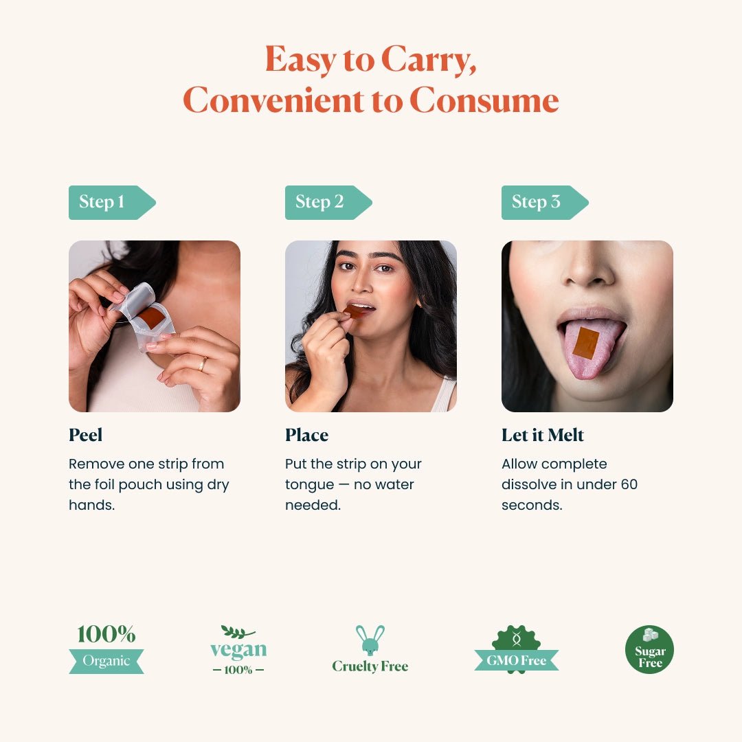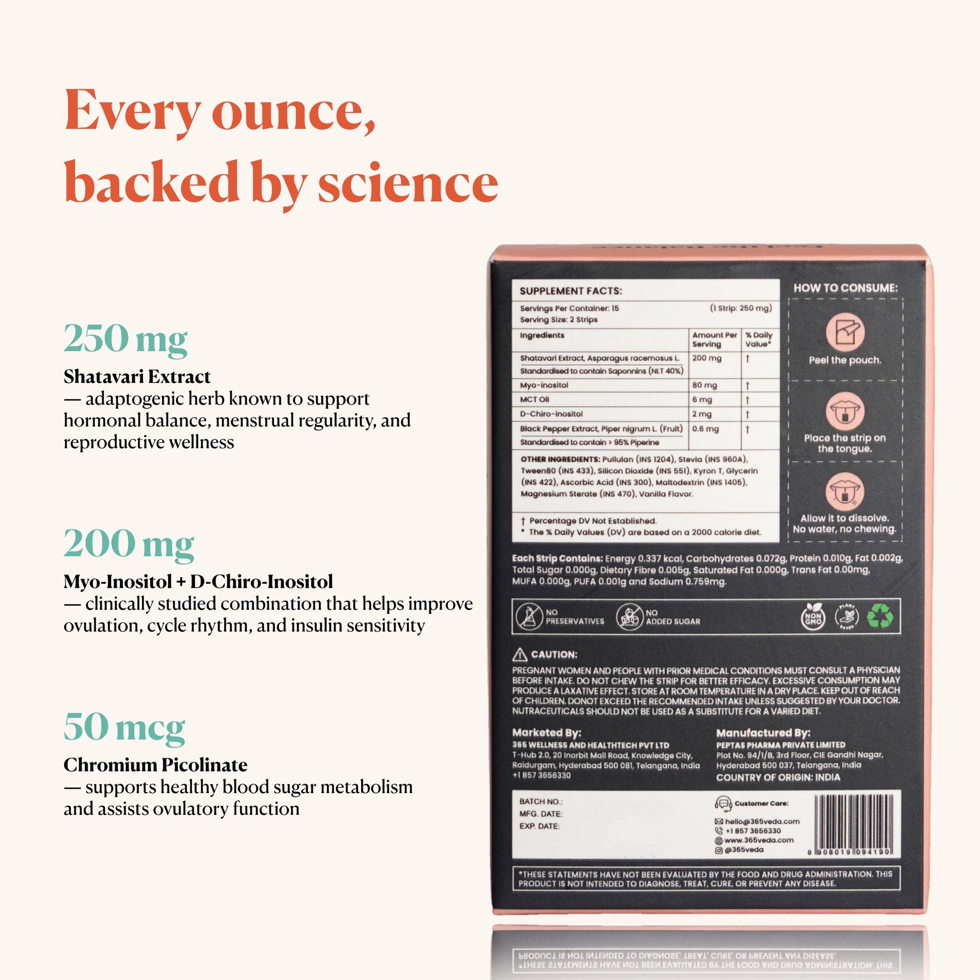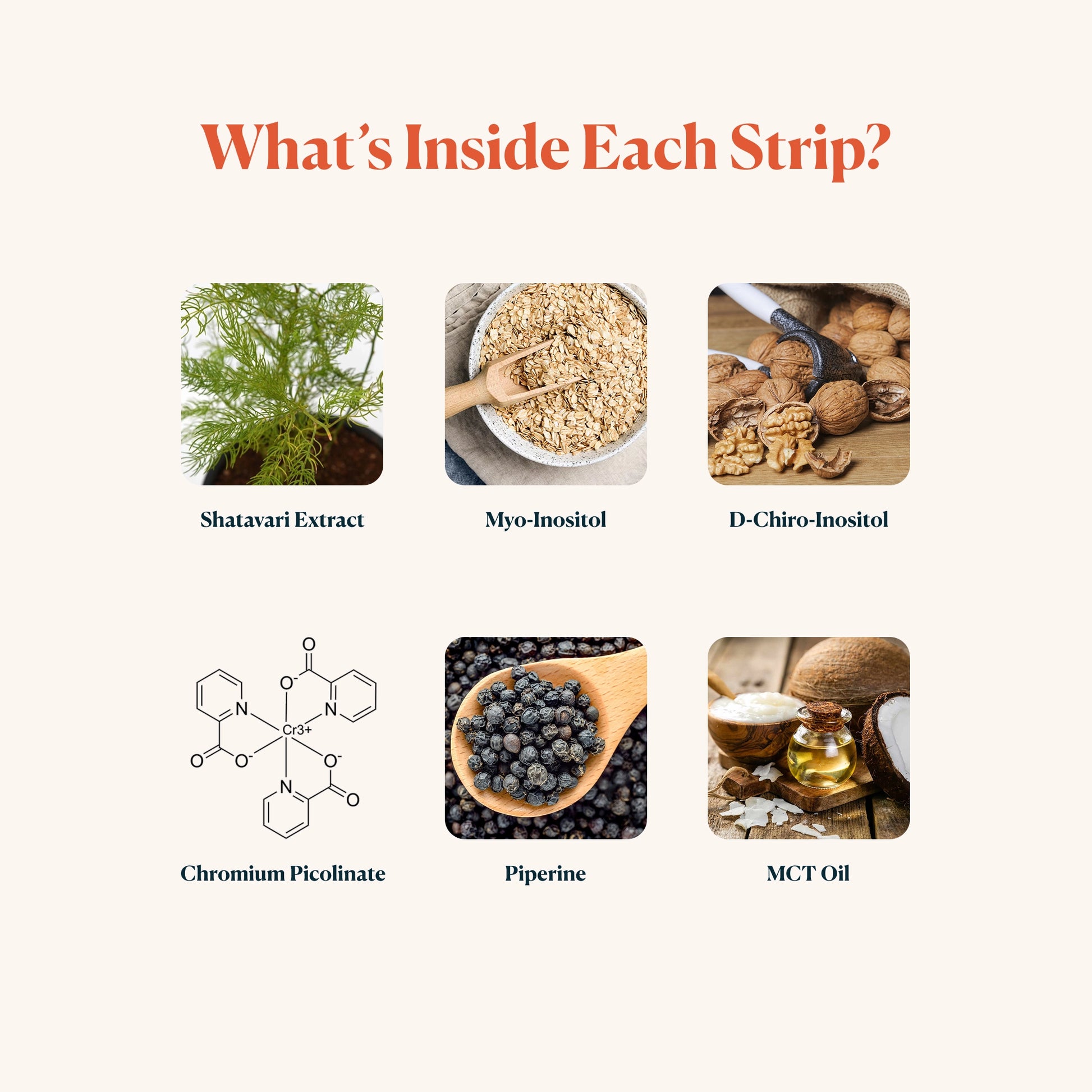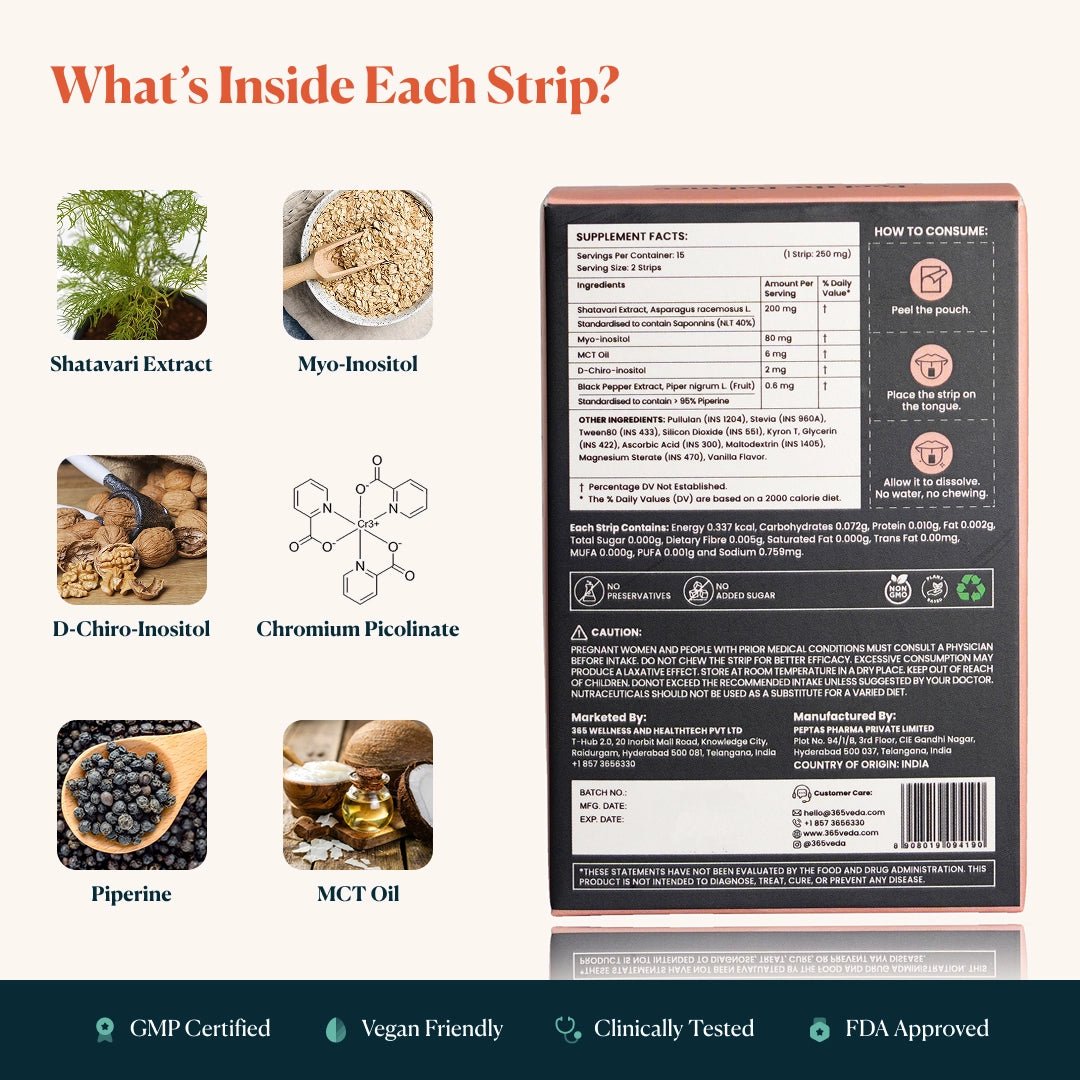 These strips combine Shatavari with clinically studied inositols and chromium, all in a fast-dissolving format for quick absorption. Unlike pills, they dissolve on your tongue, giving your body active support without the hassle of swallowing capsules.