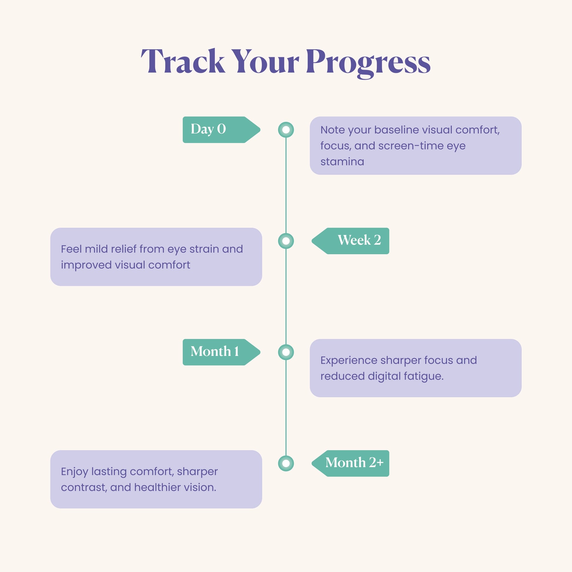 Many users notice subtle improvements in eye comfort, reduced strain, and sharper focus within the first 1–2 weeks. Full benefits for vision support and antioxidant protection usually build over consistent daily use for 4–6 weeks.