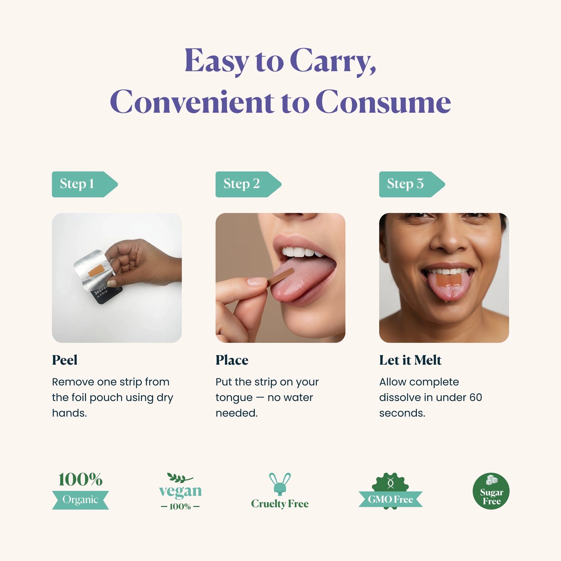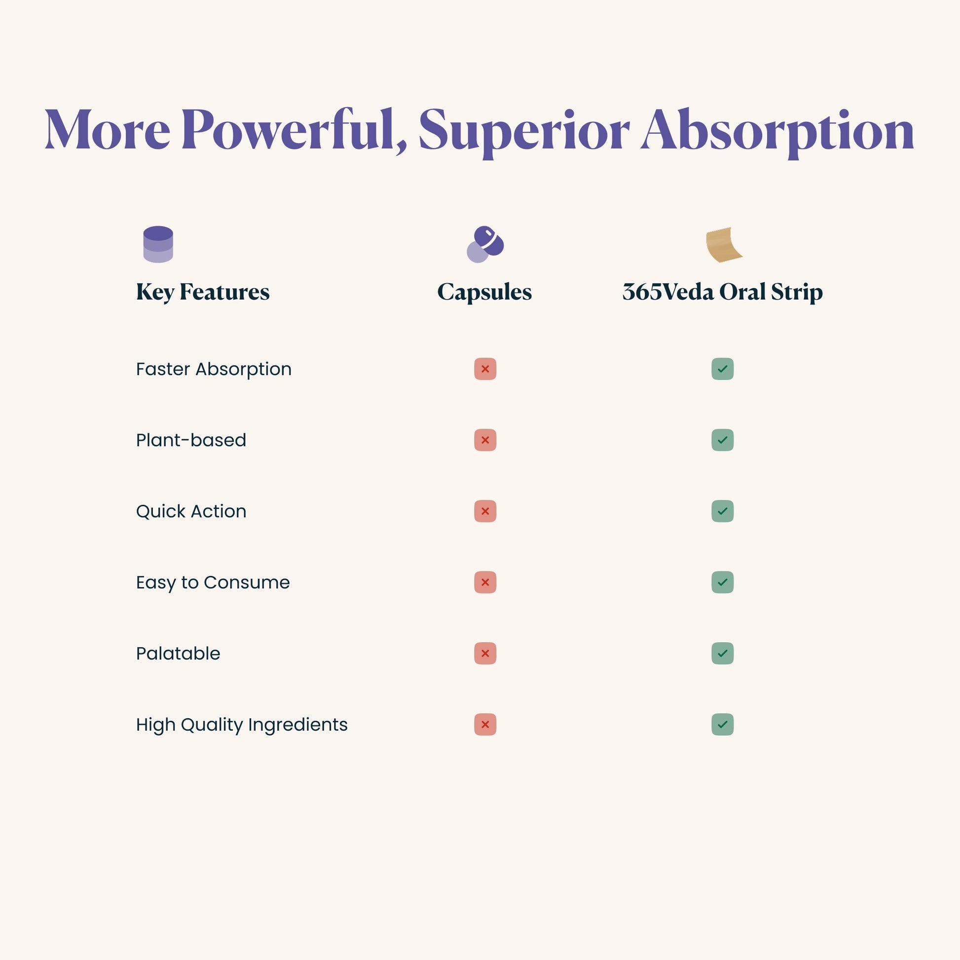 365veda oral strips dissolve on your tongue and deliver nutrients straight into your bloodstream—bypassing digestion for faster, more reliable absorption.